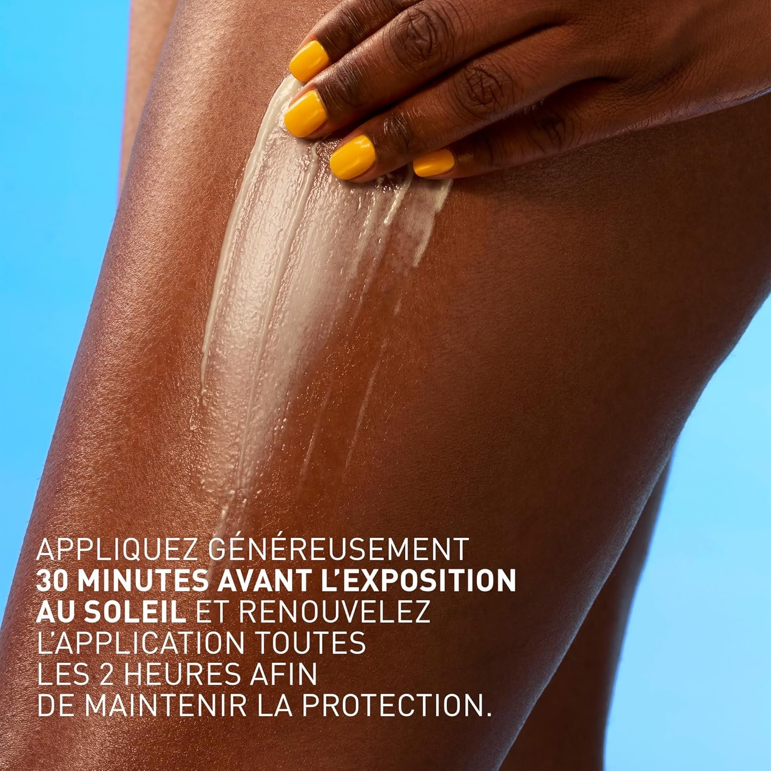 - APPLICATION : Appliquez généreusement l’écran solaire sur le visage et/ou le corps 30 minutes avant l’exposition. Renouvelez l’application toutes les 2 heures