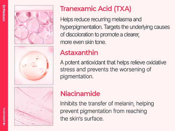 - Infused with Tranexamic Acid and Astaxanthin to prevent melasma and hyperpigmentation, restoring skin transparency.